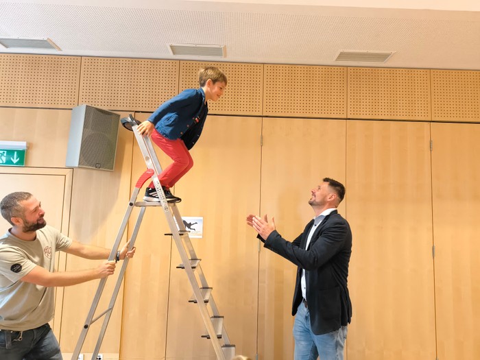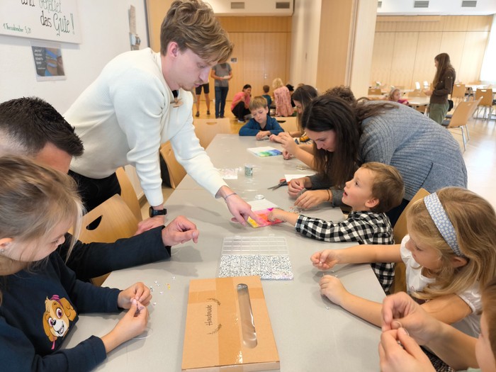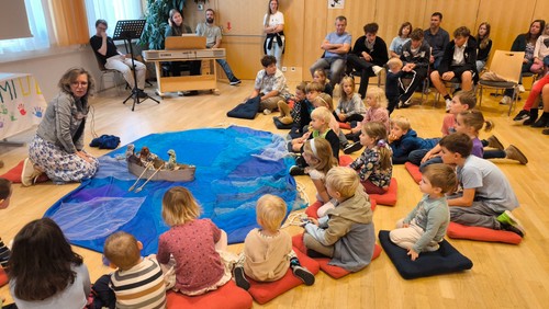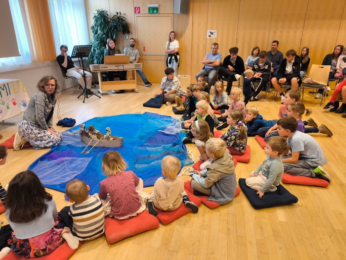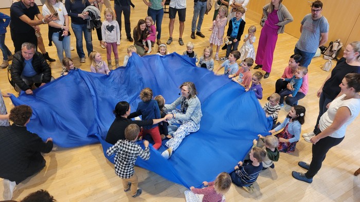 „Mutig“ – das war das Thema des vergangenen „Familie im Fokus“-Familientags in Wallern am Sonntag, dem 28.09.2025. Der Tag startete mit einem Krabbelgottesdienst, in dem mit Begeisterung das Lied „Sei mutig und stark und fürchte dich nicht“ gesungen wurde. Gemeinsam hörten wir die Geschichte von Petrus, der mutig aus dem Boot stieg. Das wurde im Anschluss an den Krabbler gleich ausprobiert. Sind die Kinder ebenso mutig wie Petrus? Abwechselnd durften sie sich in ein großes blaues Tuch setzen, während alle anderen gemeinsam die „Wellen“ machten und das Boot zum Schaukeln brachten!
