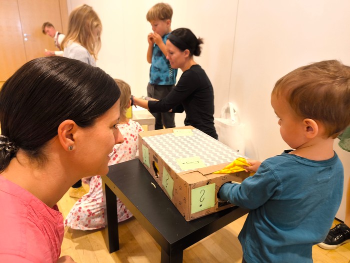 Nach dem Krabbler warteten spannende Stationen rund um das Thema Mut auf die Familien. Bei der Station Mutsprung konnten die Kinder und auch Mama oder Papa zeigen, wie mutig sie sind: Von wie hoch oben traust du dich zu springen und traut sich Mama oder Papa dich aufzufangen? Für Spannung sorgten auch das Brettspiel „Gespenster-Alarm“ und die Station Muttunnel.