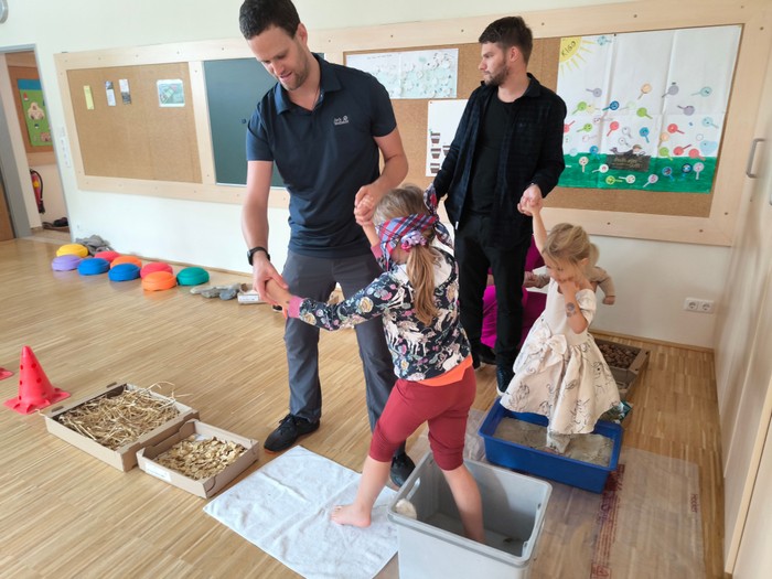Auch die Sinne kamen nicht zu kurz. Die Kinder durften barfuß und blind an Mamas oder Papas Hand durch den Mut-Parcour tappen und bei der Station Fühl-Mut Unbekanntes in einer Box ertasten. Für ganz Mutige gab es eine Essens-Mutprobe.